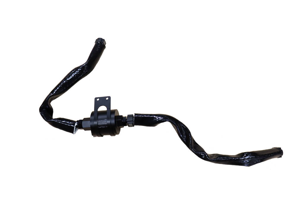 The KPM Fuel Systems high flow E-Flex filter is a direct fit to the Ford Mustang 2015 and up. The kit includes hoses and quick connect fittings. Just connect it inline between the fuel rail inlet and the main fuel line and and mount the bracket and that’s it.
